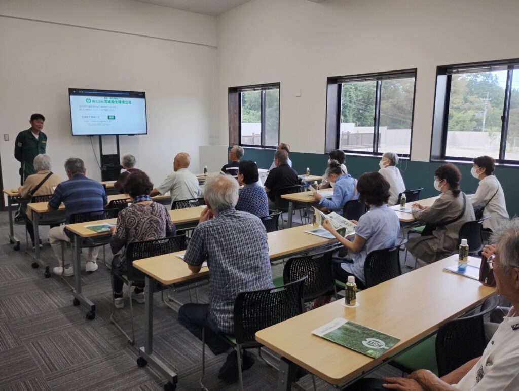 仙台市の“環境施設”として登録されている当施設、エコロジーセンター愛子。9月17日(水)に広瀬地区上町東町内会の皆さまが見学にお越しくださいました。当社の概要の他、現在の国内におけるエネルギー事情を踏まえた再生可能エネルギーの重要性や、エコロジーセンター愛子が果たす役割とその意義についての説明をし、その後、施設内を見学していただき太陽光パネルリサイクルの理解を深めていただきました。