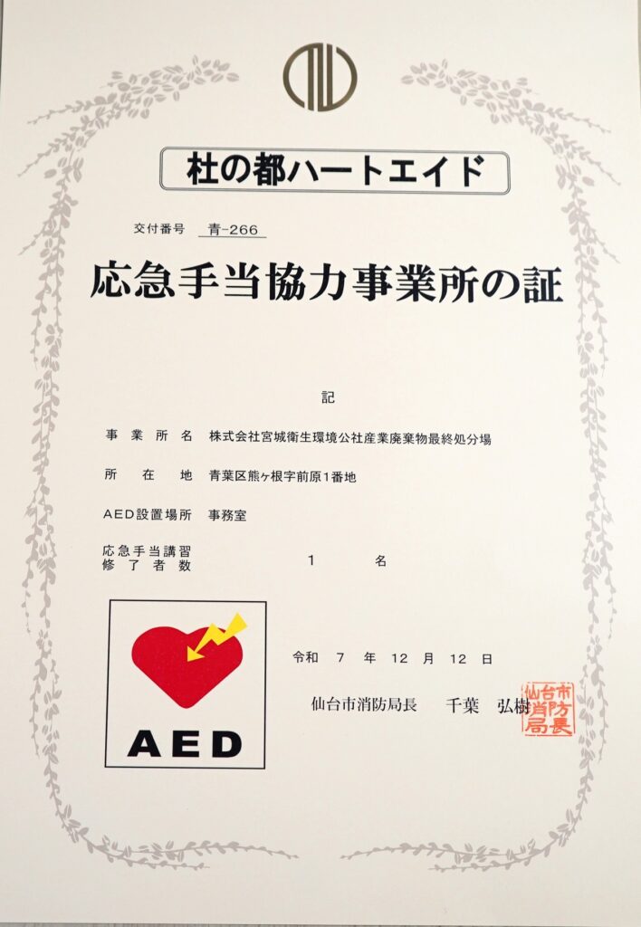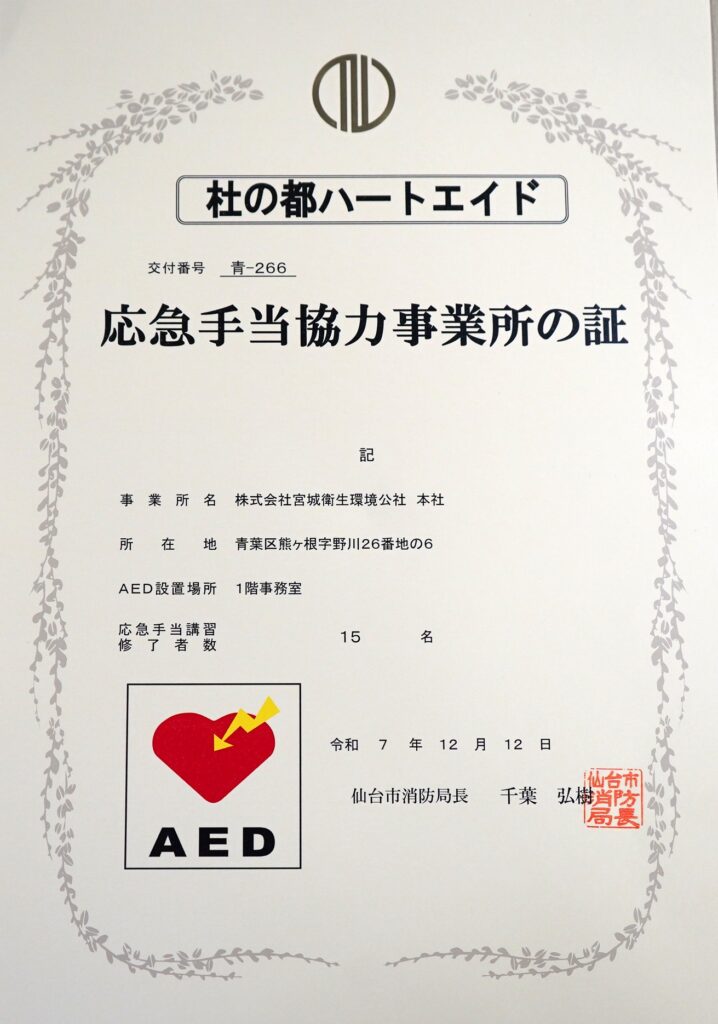 宮城衛生環境公社リクルートサイト > お知らせ > 杜の都ハートエイド制度で「応急手当協力事業所の証」をいただきました(令和7年12月)
