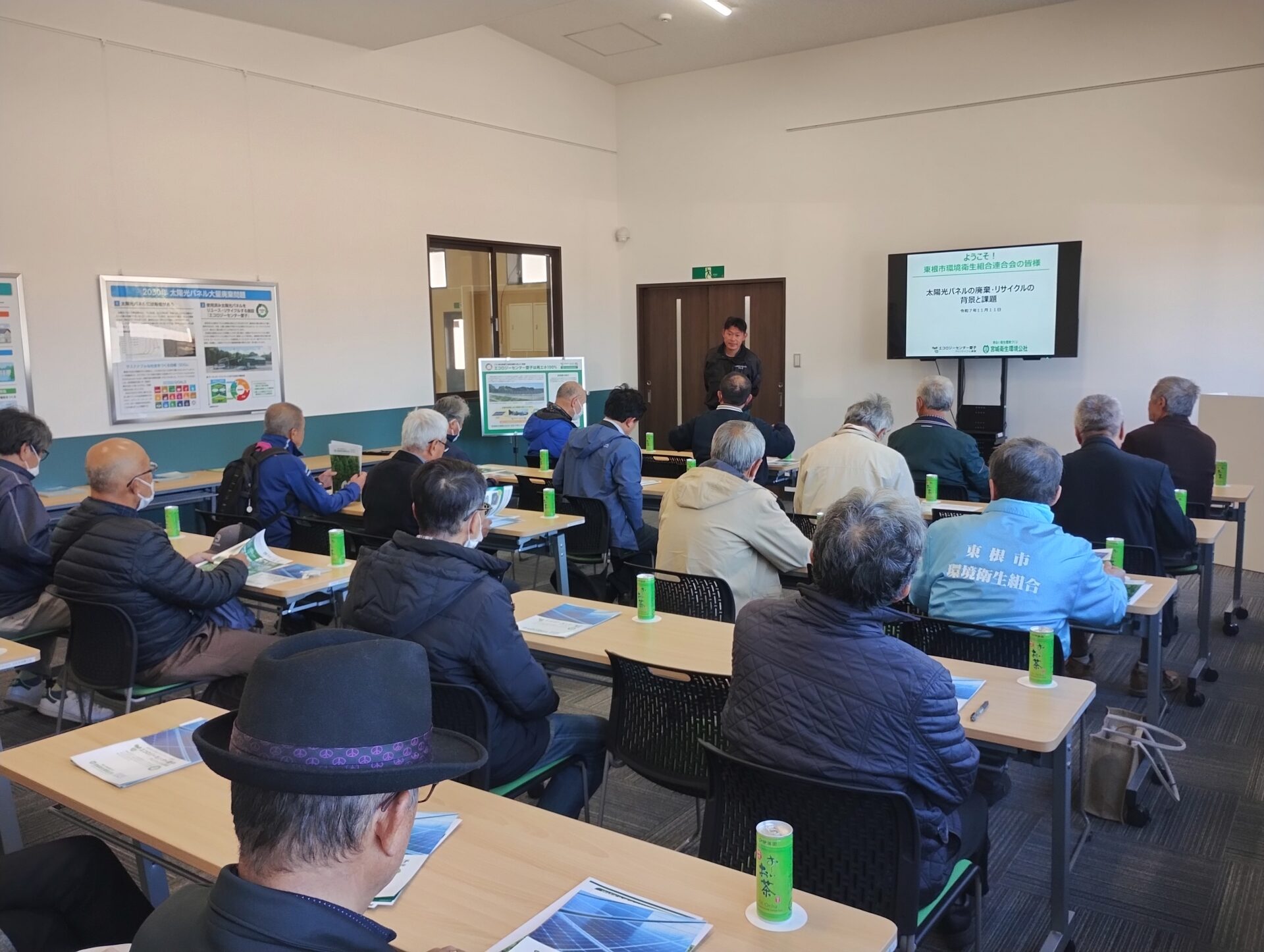 11月11日(火)、仙台市の「環境施設を見る会」に登録されているエコロジーセンター愛子に、東根市環境衛生組合連合会の皆さま22名が見学にお越しくださいました。当日は、当施設の概要に加え、再生可能エネルギーの重要性や、エコロジーセンター愛子が担う役割とその意義についてご説明しました。その後、施設内をご案内し、太陽光パネルのリサイクル工程をご覧いただくことで、理解を深めていただきました。