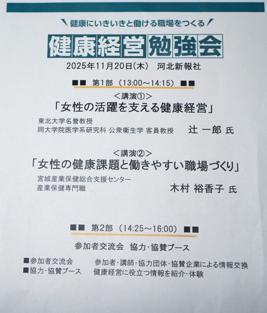 11月20日(木)、当社が登録している健康みやぎサポーターズとして河北新報社主催の健康経営勉強会に参加しました。今回のテーマは「女性の健康と健康経営」です。女性は生涯を通じて女性ホルモンの変動が大きく、働く世代(20~50代)に女性特有の健康課題が集中することから、企業における理解と支援の必要性が語られました。