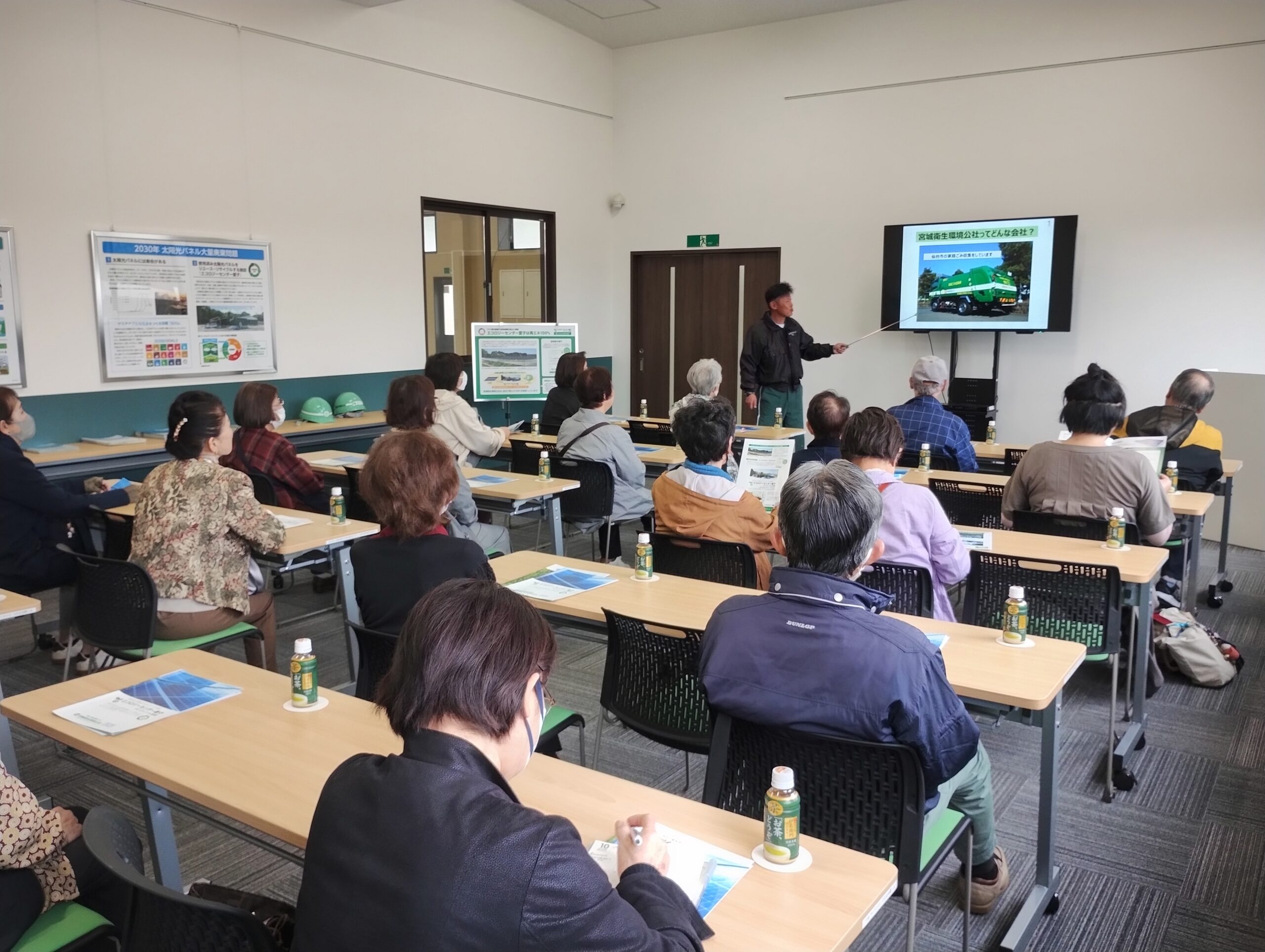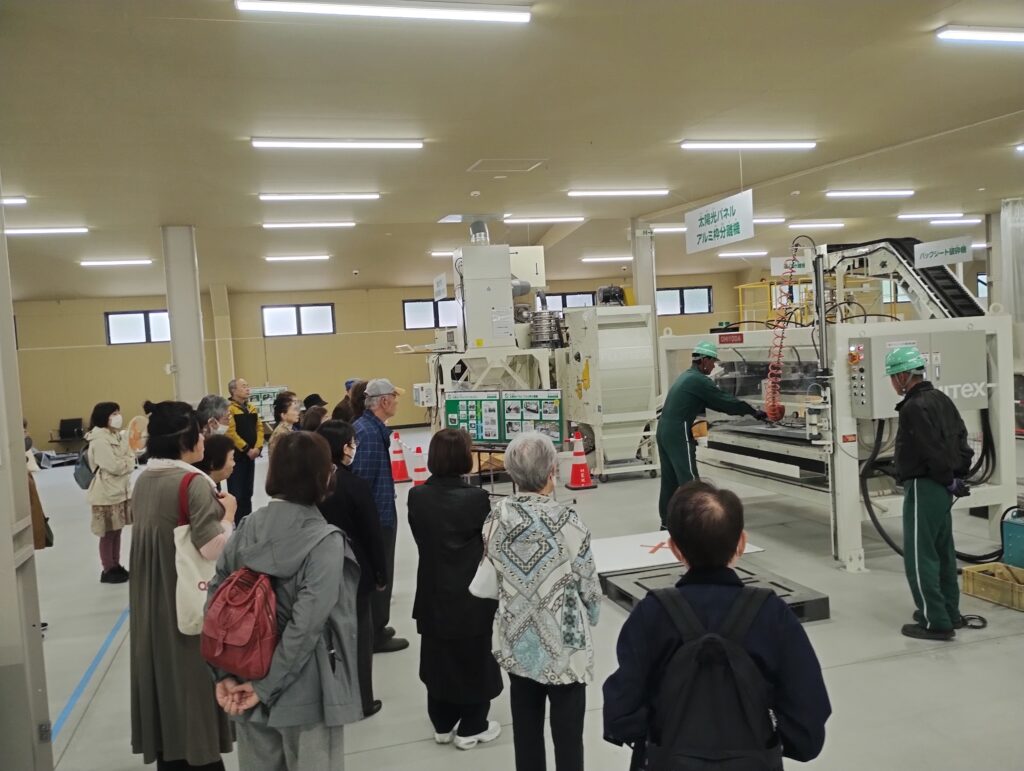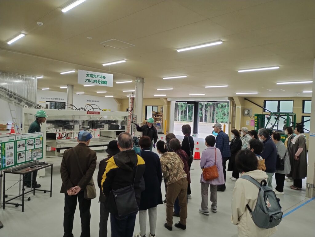 10月22日(水)、仙台市の「環境施設を見る会」に登録されているエコロジーセンター愛子に、西花苑二丁目町内会婦人部20名の皆さまが見学にお越しくださいました。当日は、当施設の概要に加え、再生可能エネルギーの重要性や、エコロジーセンター愛子が担う役割とその意義についてご説明しました。その後、施設内をご案内し、太陽光パネルのリサイクル工程をご覧いただくことで、理解を深めていただきました。